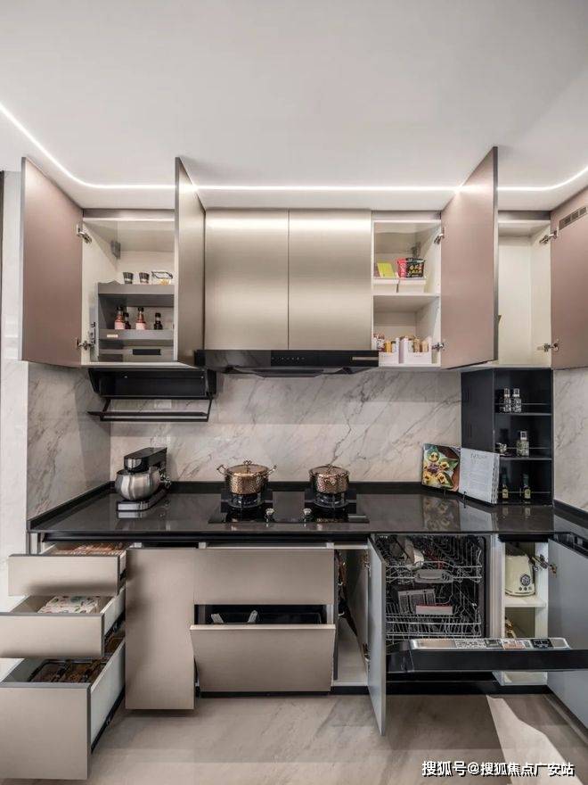 U型厨房的设计同样令人称道,整体面积约7.5㎡,台面总长约5.8米,比常规户型多出25%的操作空间,两人下厨绰绰有余,洗切烹炒盛更高效顺畅,让烹饪成为一种享受。