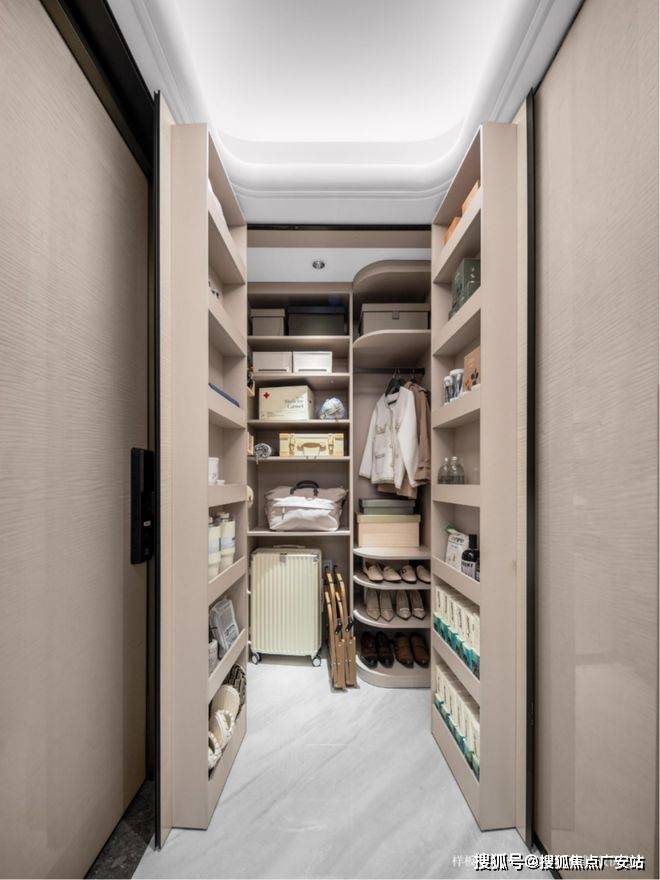 125㎡户型仅仅在客厅公区,就打造了三处整面墙的柜子来做收纳,除了传统的收纳柜,还有隐藏推拉零食架、内嵌式吧台等创新收纳方案,从衣服鞋帽,到大件行李箱再到家用清洁工具,都有专属的安置空间。
